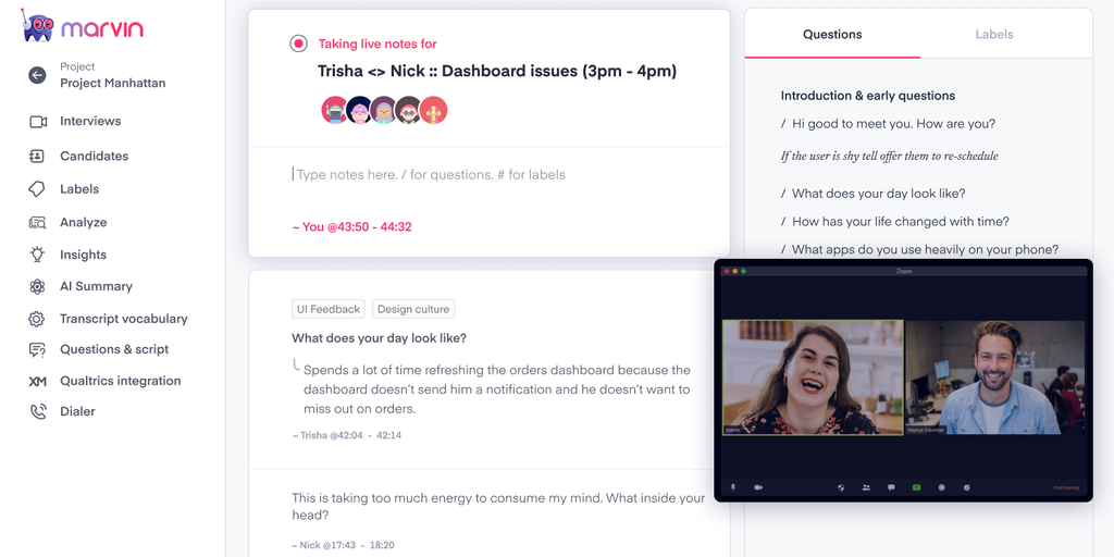 Marvin is the best and most collaborative way to conduct user research. Marvin automates all aspects of user research, from setting up the interviews, recording the calls, taking notes, analyzing data
