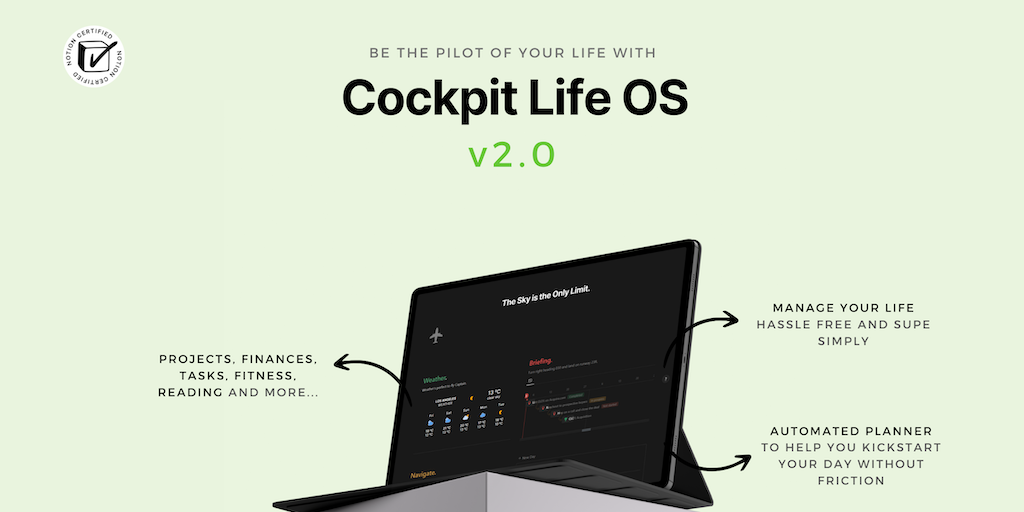 This Notion template is a sequel to the successful Cockpit Life OS v1.0 and offers a comprehensive solution to manage every aspect of your personal life. With an Automated Daily Briefing, a Powerful T
