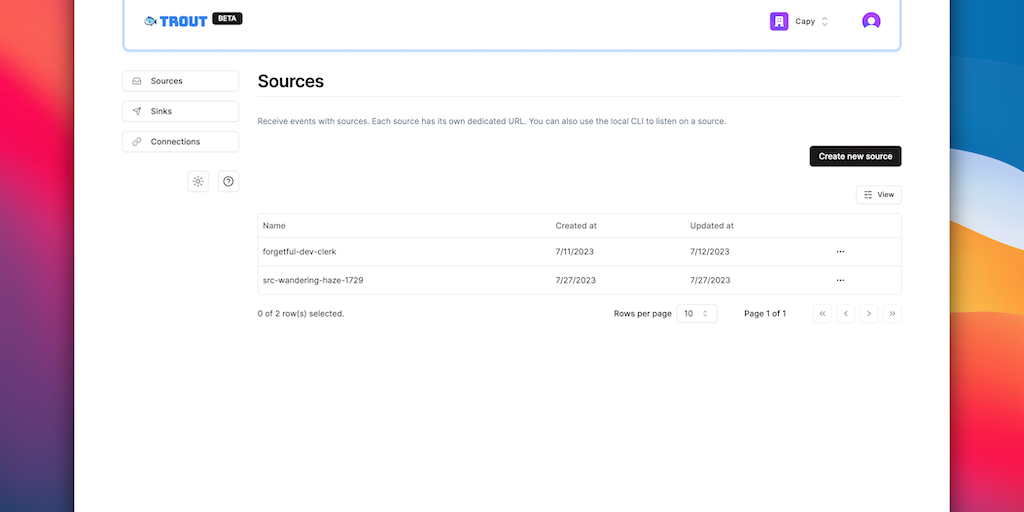 Trout is a webhook relay. Use sources to receive events from third parties like Stripe. Use sinks to forward those events to your apps. Use the Trout CLI to listen to sources locally and forward event