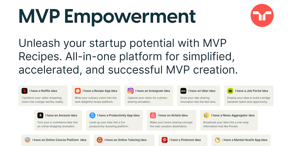 Bring your startup vision to life with MVP Recipes! Our 150+ unique no-code templates, 250+ tools, and Lean Startup guide are the perfect start for any entrepreneur.