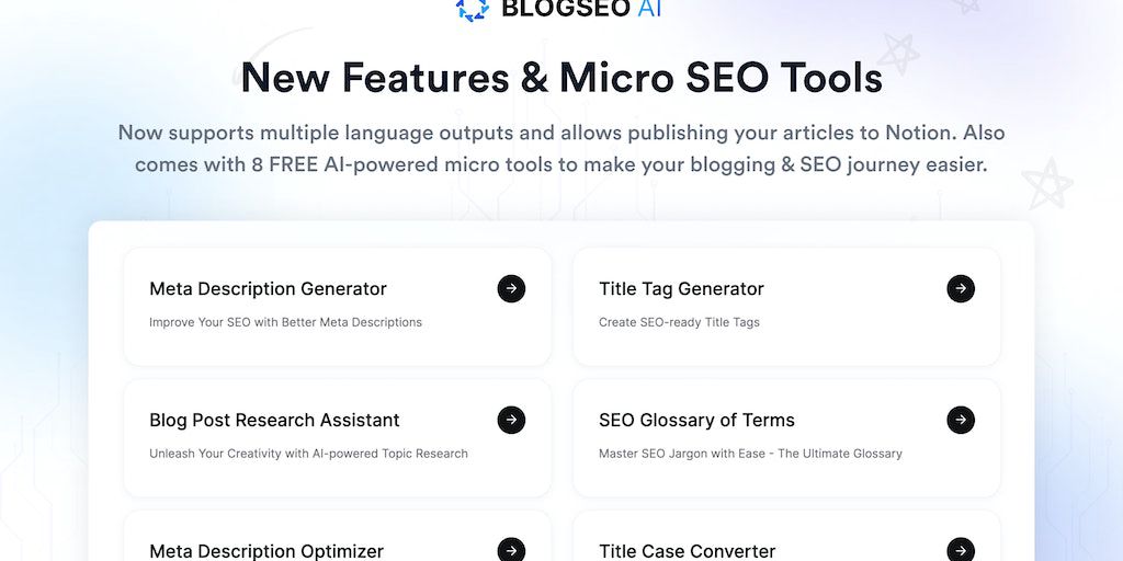 BlogSEO AI now supports multiple language outputs and allows publishing your articles to Notion. We've also shipped 8 new AI-powered micro tools to make your blogging & SEO journey easier.
