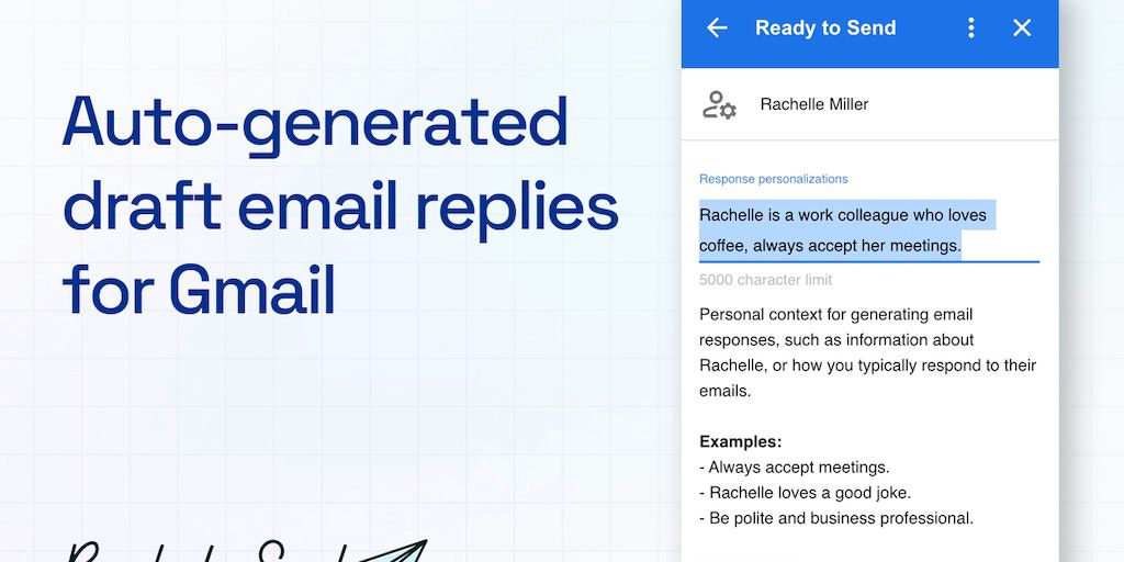 Ready to Send is an AI-powered email assistant for Gmail that generates personalized draft replies automatically! Ready to Send works in the background, finding new emails and generating complete draf