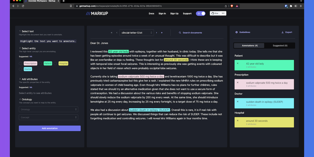Markup is a free & open-source annotation tool for transforming text into structured datasets that you can use to train ML models. Markup uses GPT-4 to learn how you annotate, so it can make smart sug