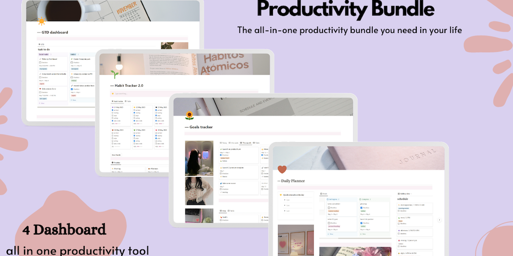 This productivity bundle is a collection of 4 Notion templates designed to enhance productivity and efficiency in various aspects of work and life. You'll get a GTD dashboard, goals tracker, daily pla