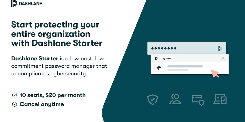Dashlane Starter is the affordable solution to start securing your team for a flat monthly price. Easy to use and loved by employees, Dashlane Starter is the perfect tool to keep your team safe withou