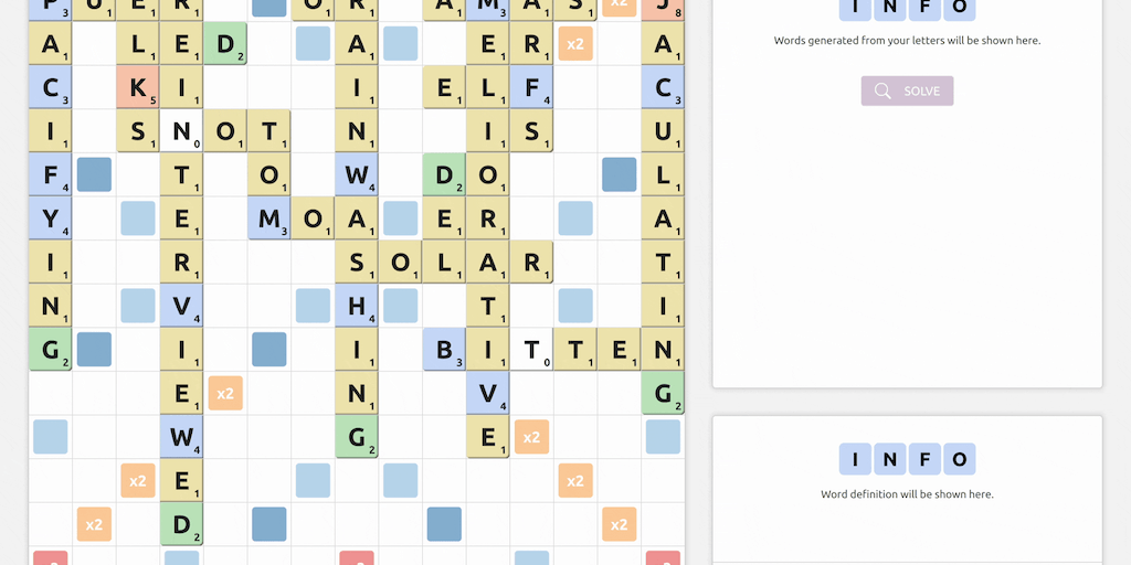 Scrabble Solver is a free, open-source, and cross-platform analysis tool for Scrabble & Literaki. Quickly find top scoring words using given letters and board state. Available in English, French, Germ