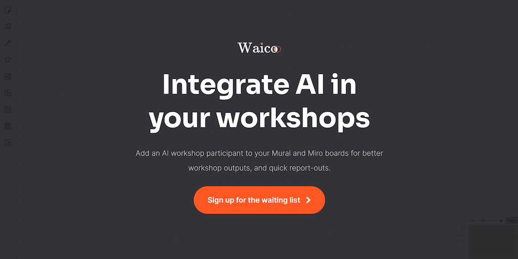 Waico allows you to collaborate with AI in your Mural and Miro boards. Generate additional workshop ideas, synthesize workshop learnings, generate workshop report-outs. More ideas, better workshop fol