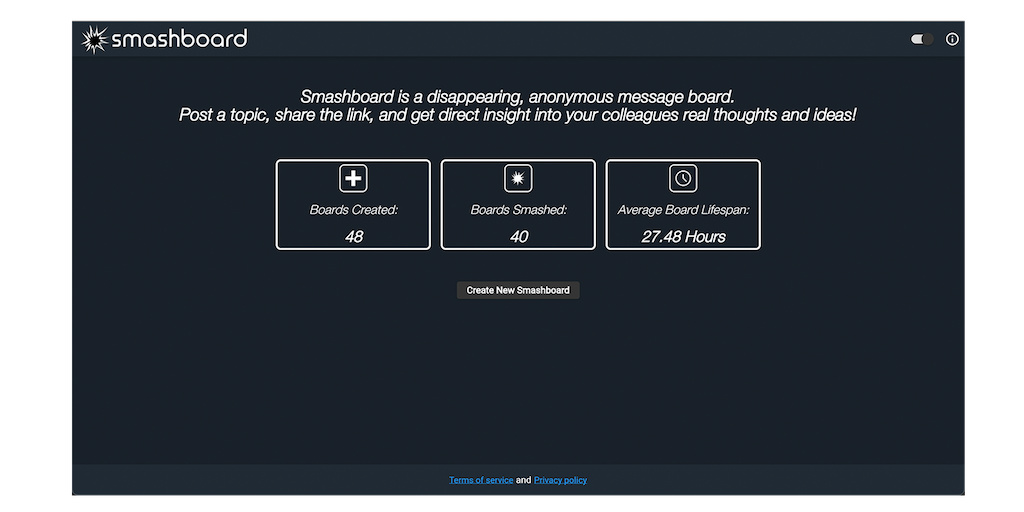 Smashboard is a disappearing, frictionless, and anonymous message board, with the goal of obtaining honest feedback for managers to better their teams by removing fear & flattery from tough topics.