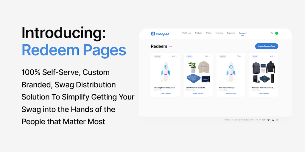 Redeem by SwagUp allows you to seamlessly create and manage beautiful landing pages for collecting swag recipient information and distributing your swag all over the world. https://redeem.swagup.com/5