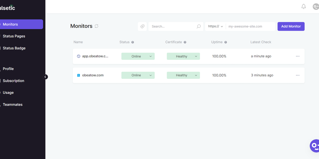 Pulsetic makes monitoring your SaaS products simple and easy with Status badges to show the status of the site without changing pages and you will also be alerted when your site goes down. You can eve