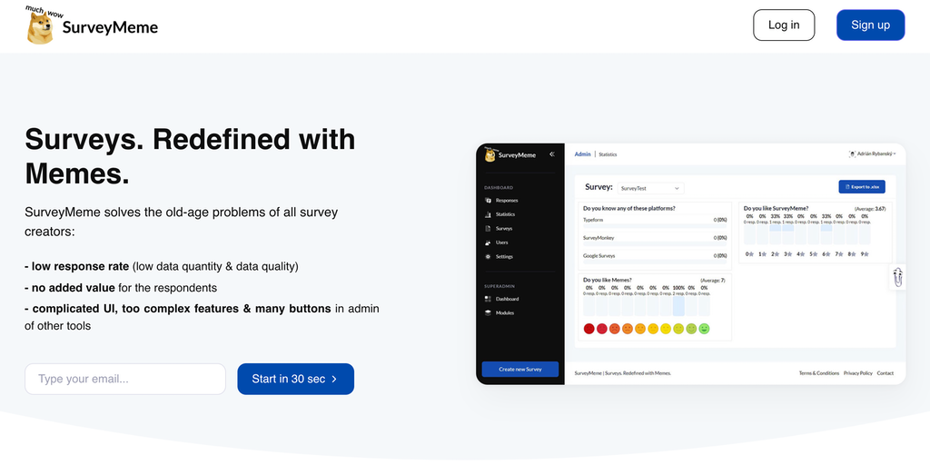 Surveys redefined with Memes. Simplest SaaS survey tool with the cleanest admin UI. Special Meme feature on thank-you page as added value for respondents.