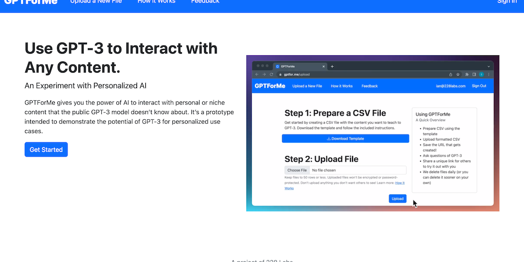 GPTfor.me is an experiment that lets non-technical people try out teaching an AI about a new subject. It lets you upload a CSV, then ask questions and interact with the content in a similar way to Cha