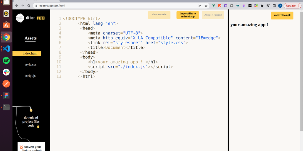 EditorGapp is an online editor you can write your code and see results in real-time and you can download your code as HTML CSS JS files also You can also convert/generate an android app with a valid k