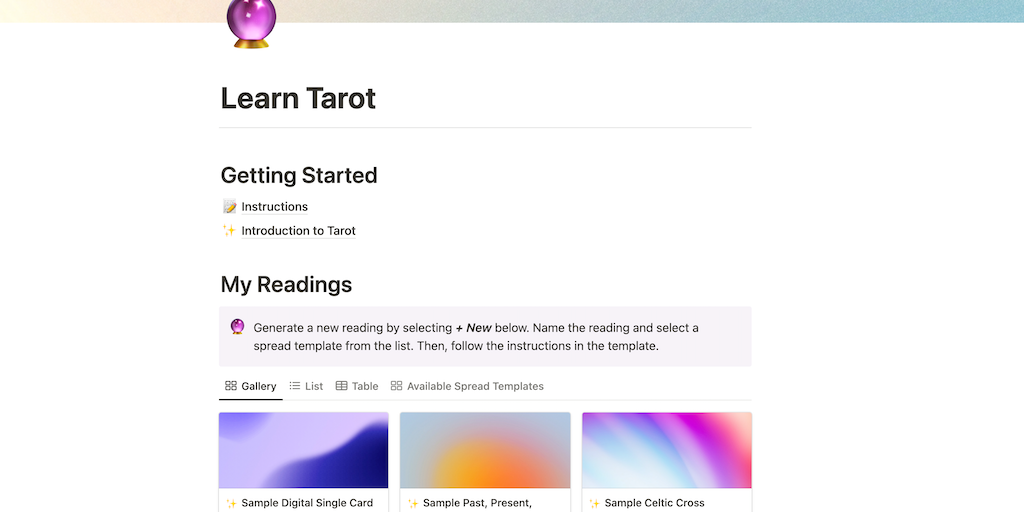 Predict your future and instantly generate 30+ types of digital tarot readings– all in Notion! Whether you're brand new to tarot and a bit skeptical or a practiced intuitive reader, enjoy this quick a