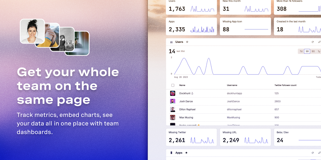 With dashboards, every team in your workspace gets its own customizable page to show data like daily signups, WAU, or anything else you store in your database. Create views and queries with AI in seco