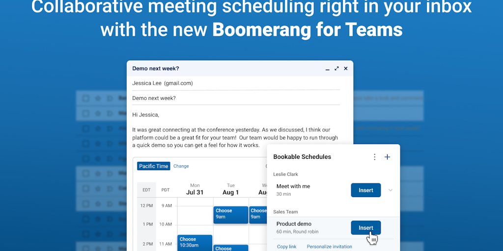 Grow your business with faster meeting scheduling for the entire team. Our new meeting scheduling for teams takes hours of back-and-forth emails out of scheduling meetings. Boomerang integrates into y
