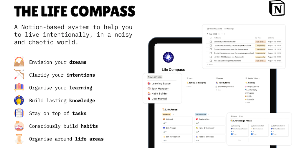 Free your mind; live by design. The Life Compass is a Notion-based system to help you create a more intentional, aligned life. 🧠 Reclaim your attention 🏹 Clarify your intentions 🗻 Set meaningful goals