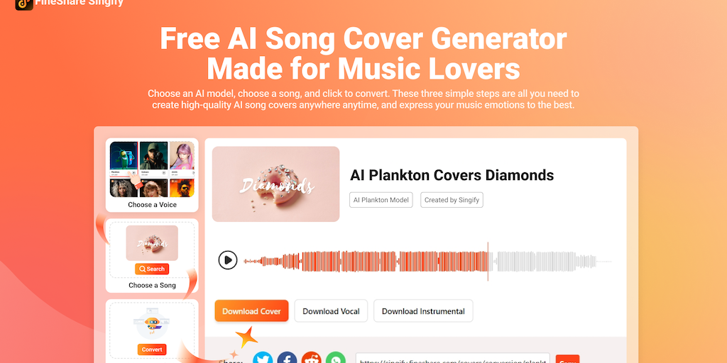 FineShare Singify is an online AI Song Cover Generator. Whether you are a music lover or a creator, you can easily turn your favorite songs into unique and personalized masterpieces with the power of