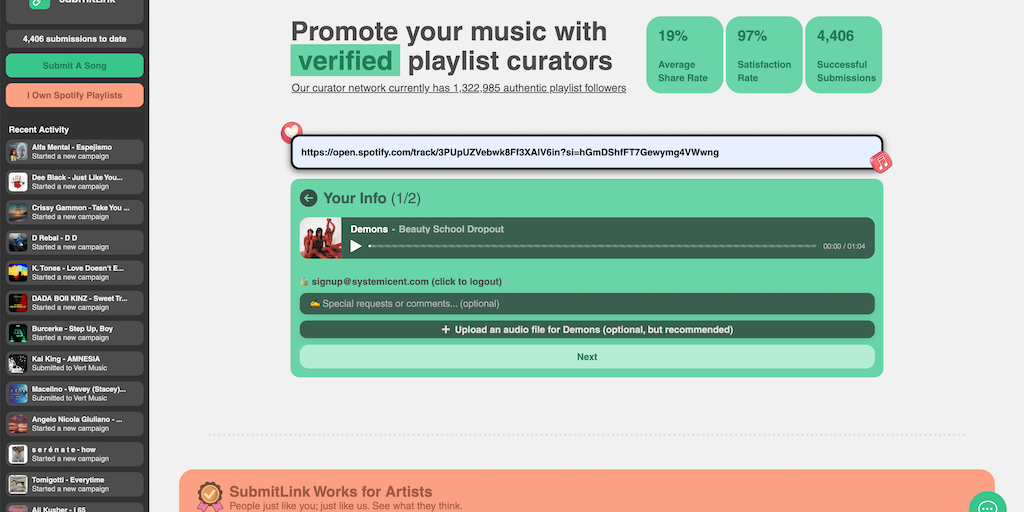 SubmitLink provides monetization solutions for verified Spotify playlist curators by connecting them to artists looking to run playlist marketing campaigns on Spotify.