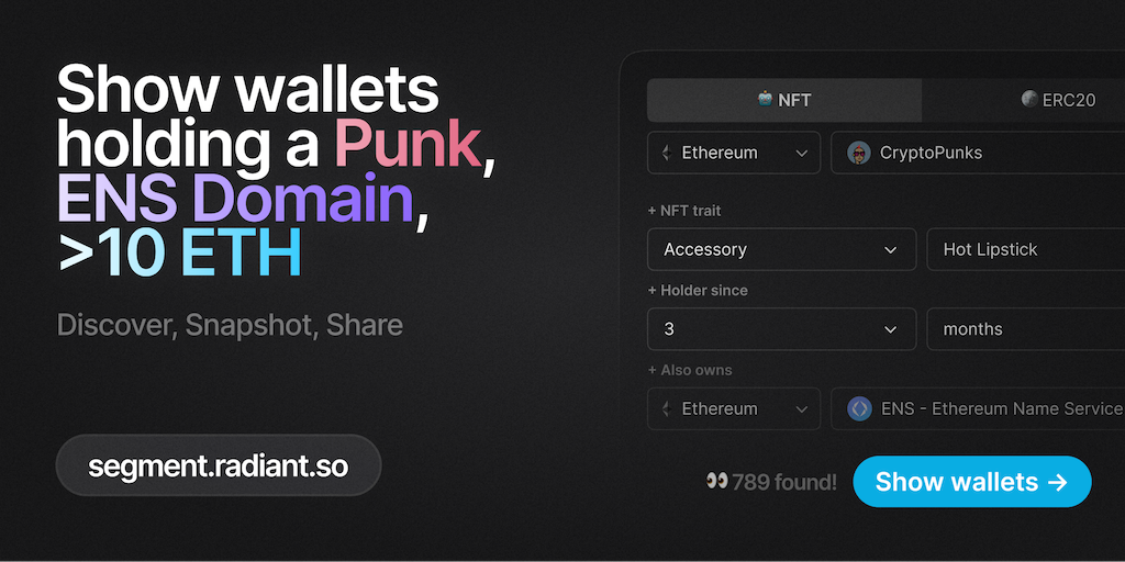 Radiant Segment is the easiest way to build segments based on wallet NFT & Token portfolios. Select one or multiple Tokens & NFTs, set up filters, get a snapshot of all wallets matching your filter cr