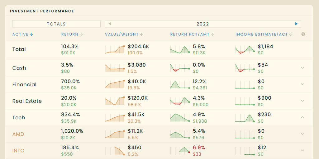 Quickly compare your returns across stocks, bonds, real estate, crypto, options, and more. Tracking returns and income across multiple investment types is tedious and difficult - ditch the spreadsheet
