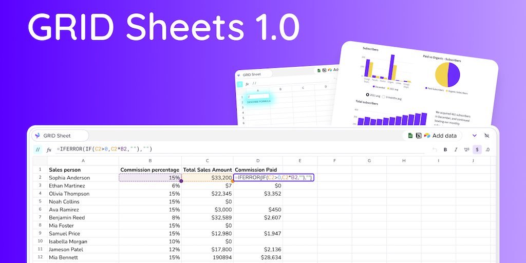 GRID is the magical hybrid of a smart spreadsheet & a text editor. We're happy to announce that GRID Sheets, our built-in spreadsheet editor is now out of beta! ✨ AI formula assistance powered by GPT