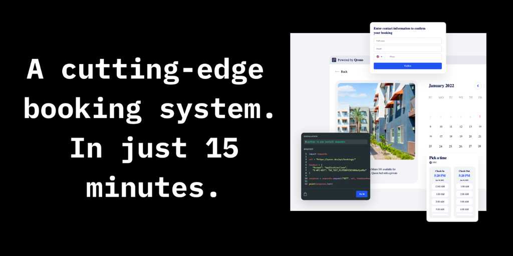 Qrono is the fastest way to build a rental company. We handle the full-stack for booking and scheduling: no-code embeds, frontend components, and developer-friendly APIs.