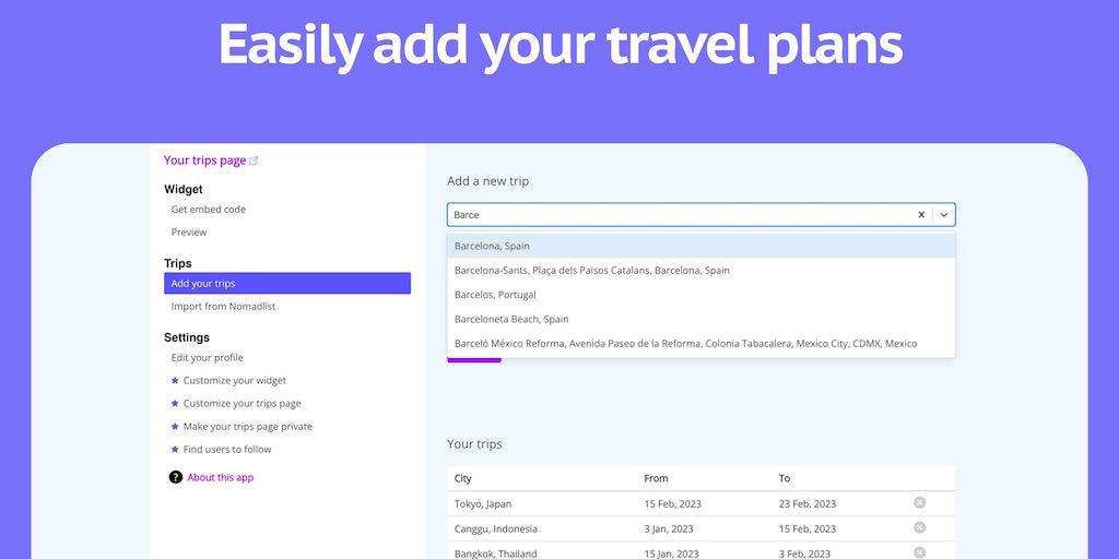 WhereIs lets you share travel plans easily. Add your trips and get a page with your own travel schedule, or embed the widget on your own website.