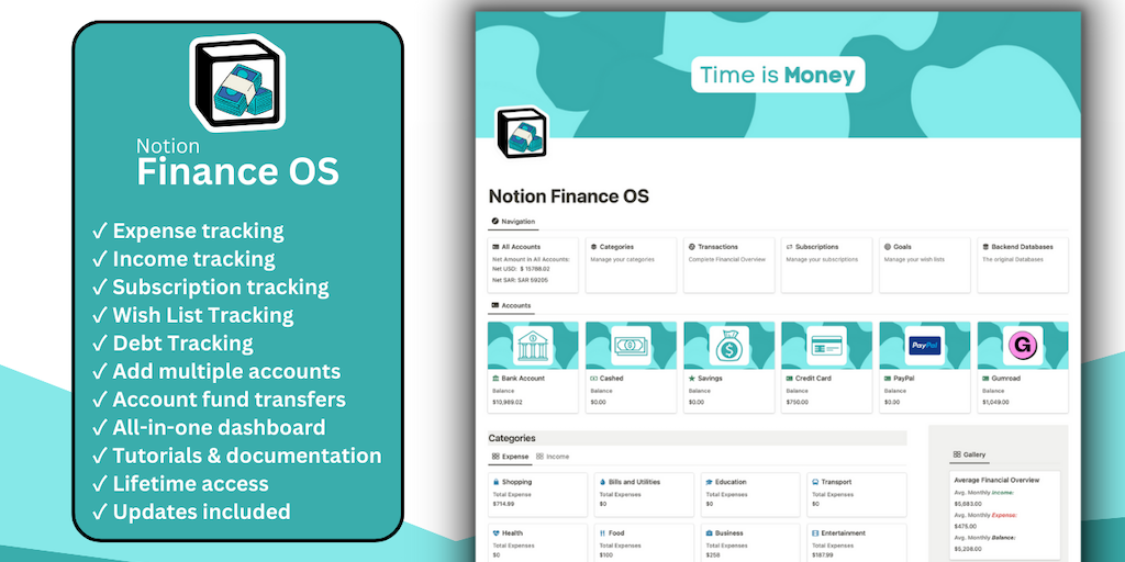 Finance OS is an all-in-one system built in Notion that lets you easily manage and keep track of your finances.