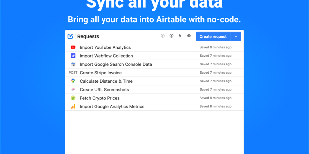 Data Fetcher is the easiest way to import data to Airtable without code. Use our integrations to import Google Analytics data, Webflow collections, stock prices and lots more. Use custom requests to c