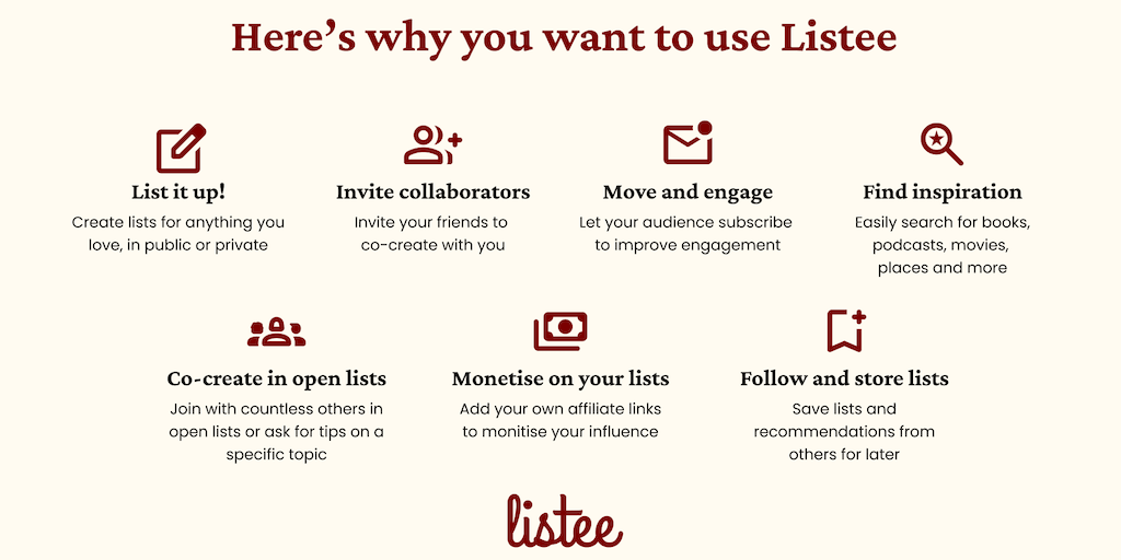 With Listee you can create lists with recommendations: from books to movies, and from restaurants to podcasts. Keep them for yourself, share them with the world or co-create with friends and followers