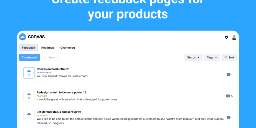 Convas is a feedback page where your users can openly share, discuss and upvote product feedback. You can share your roadmap, changelog, and automatically let your users know when you launch something