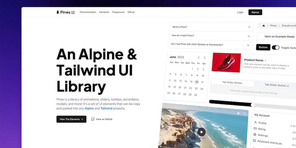 Pines is a library of animations, sliders, tooltips, accordions, modals, and more! It's a set of UI elements that can be copy and pasted into any Alpine and Tailwind projects.