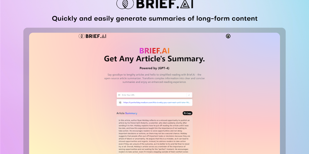 BRIEF.AI is an AI-powered article summarization tool that allows users to quickly and easily generate summaries of long-form content. Say goodbye to lengthy articles and hello to simplified reading wi