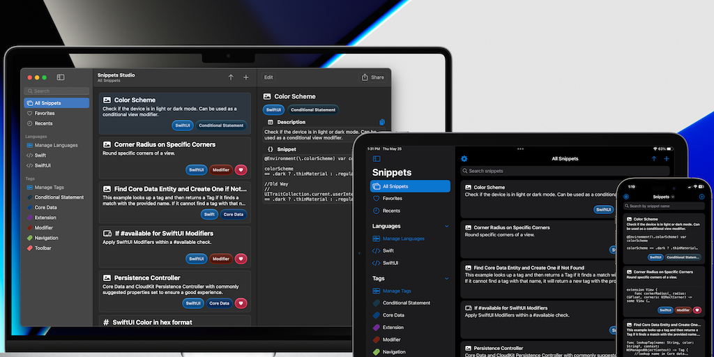 In Snippets Studio, save code that you frequently use or want to reference later. Organize your code with custom languages and tags and sync your snippets to your iCloud-enabled devices. No need to se