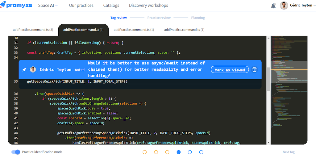 Introducing Promyze AI. Generate best coding practices from your IDE. Let Promyze review your source code and provide coding practices suggestions. Discuss them as a team during a Promyze workshop. Av
