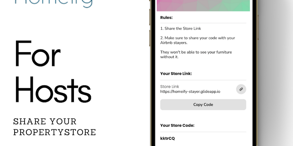 Homeify is a new and upcoming furniture-sharing app. We connect Airbnb furniture and furniture lovers! We aim to make hosting more enjoyable and buying furniture easier.