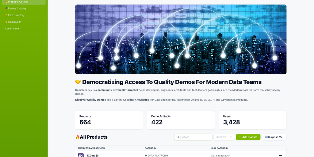 Demohub.dev is a community-driven platform that democratizes access to quality demos for engineering teams and tech leaders to get insights into the Modern Data Platform tools they use. A picture is w