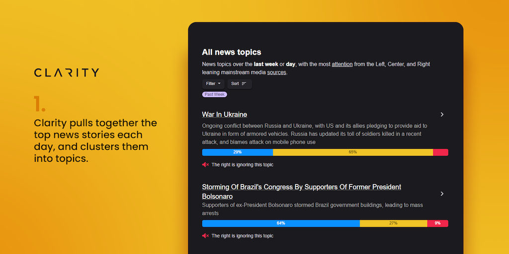 Clarity is an AI powered news reader to help reduce media bias and pop your filter bubble. We use GPT to summarize how the right, left, and center have been reporting on a given topic and highlight an