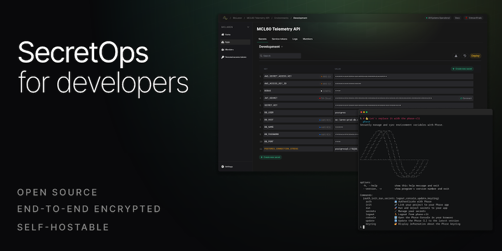 Phase is an open source, end-to-end encrypted platform for managing application secrets and environment variables. Developers can import secrets fromenv files, securely encrypt and sync them with thei