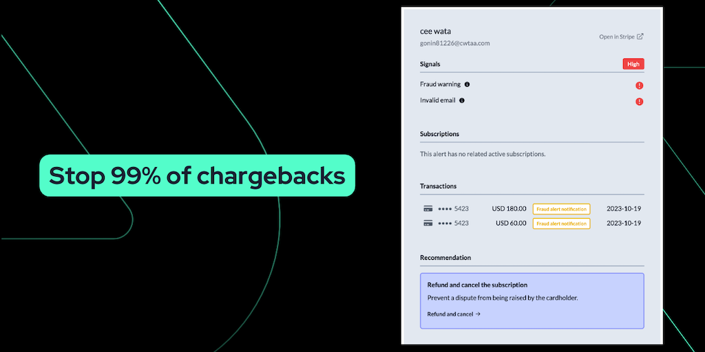We automatically detect and prevent 99% of chargebacks in your Stripe account.