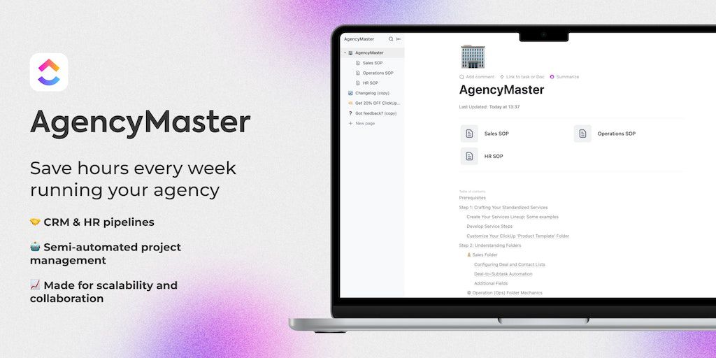 Streamline your sales, operations, and HR tasks. Tailored for agencies, this ClickUp template integrates automation and customization to drive unmatched productivity.
