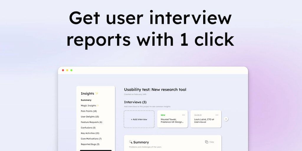 Userview is the easiest way to analyze user interviews. Simply upload your recorded interviews, and share professional research reports in minutes ✨ Save time & money ✨ Validate ideas & features ✨ Bui