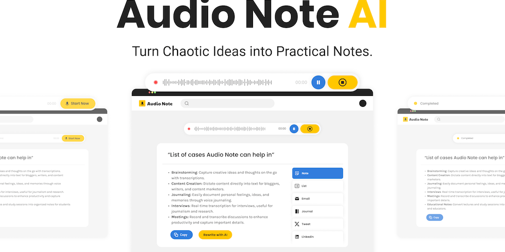 Transform thoughts into text effortlessly with Audio Note. Speak your mind and let AI refine it into formats of your choice like Journal Entries, Tweets, Notes, Lists or LinkedIn Posts. Unlock the pow