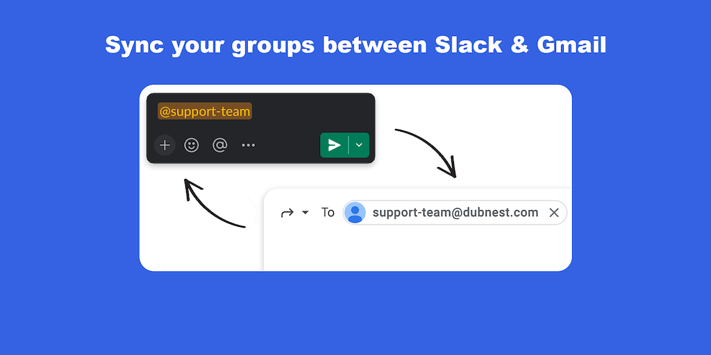 GroupSync automatically syncs your groups between Google and Slack. Tag @support-team on Slack and rest assured that emails to support-team@yourcompany.com will reach the same people.