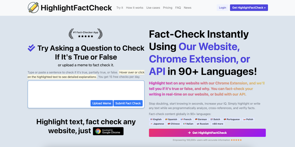 HighlightFactCheck.com is your smart companion for verifying online information. Get instant fact-checks, use our tools to analyze claims, and browse with confidence. Use our website, chrome extension