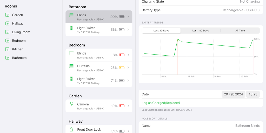 HomeBatteries makes it super quick & easy to see all of your HomeKit accessory batteries in one location. HomeBatteries enables you to view all of your Apple Home device battery levels in one place an