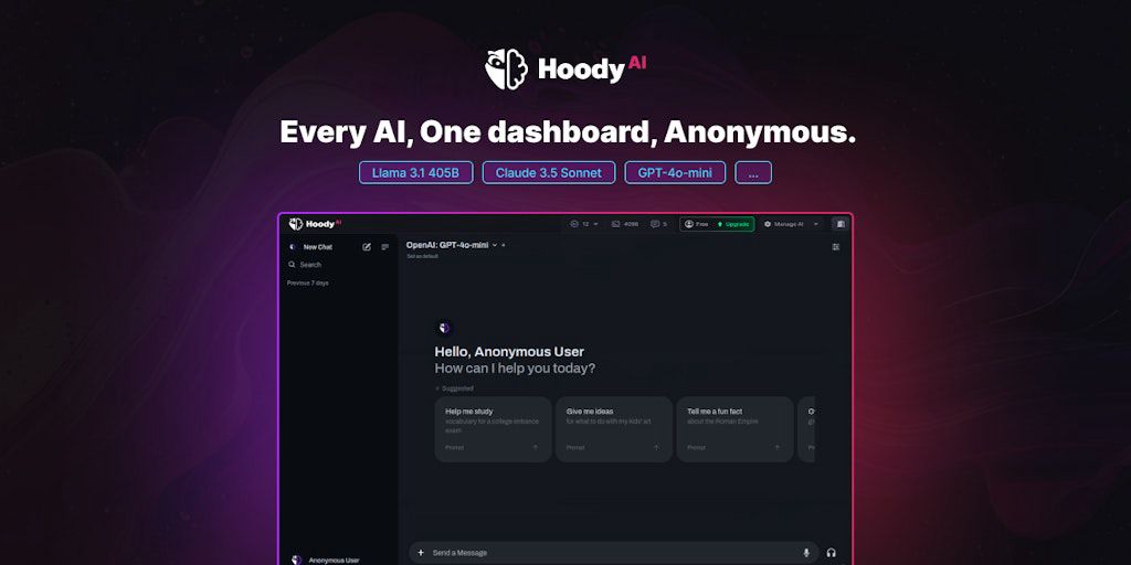 Hoody AI is a dashboard providing anonymous access to the best LLMs (OpenAI, Anthropic, Google, Meta...). Chat to multiple models at once, interact by voice, upload documents, edit prompts... All in o