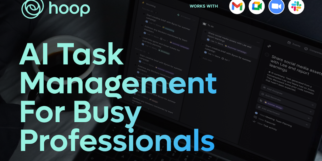 Hoop connects to tools like Google Meet, Zoom, and Slack and uses AI to grab all your tasks. One consolidated list that follows you from meeting to Slack channel to meeting. Boom!