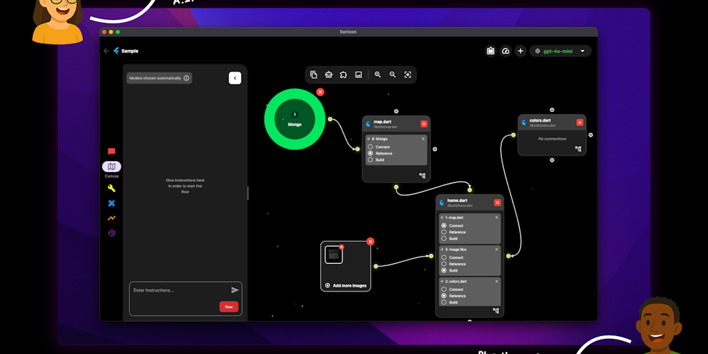 Horizon is the first AI tool which: 1. Helps you understand AI generated code by building a easy to understand flowchart. 2. Let's you integrate any package from GitHub, Pub, NPMJS or PyPi. 3. Have mo